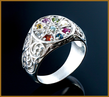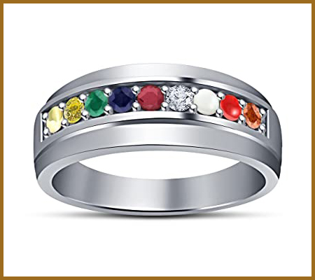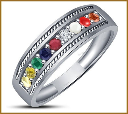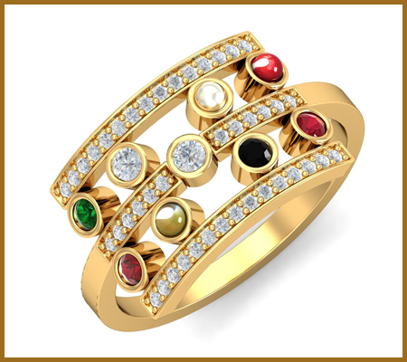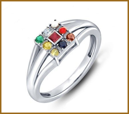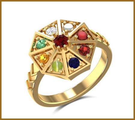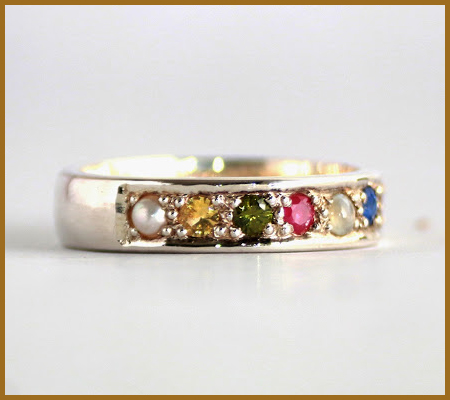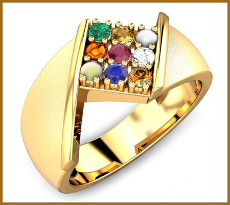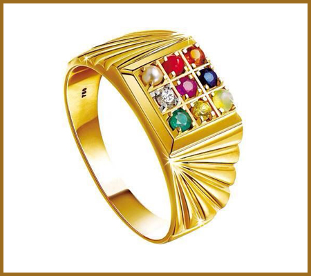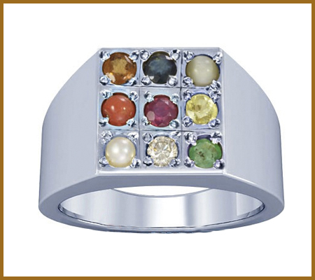 The nine stones are representative of the planets, the sun, and the moon. These gem stones comprise of Diamond, Ruby, Emerald, Yellow Sapphire, Garnet, Blue Sapphire, Pearl, Cat's eye and Coral. The entire benefits linked with these stones are bestowed upon the person wearing the ring.